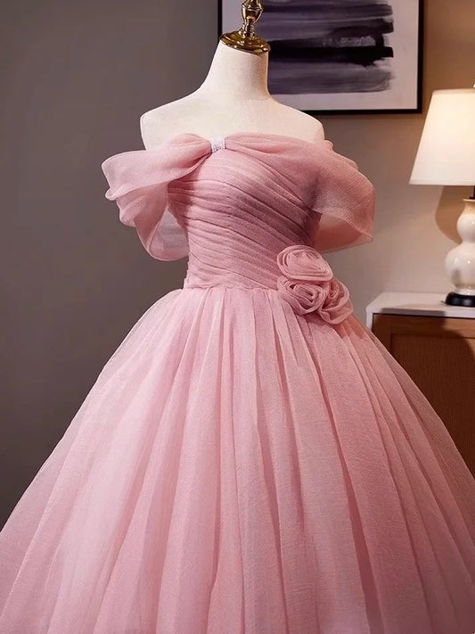 Pink Rose - Off-the-Shoulder 3D Floral Ball Gown, Tulle Train Princess Dress gh7071