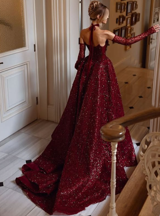 Burgundy shiny sexy Sequins elegant sweetheart neckline Long slit ball gown evening dress with gloves gh3134