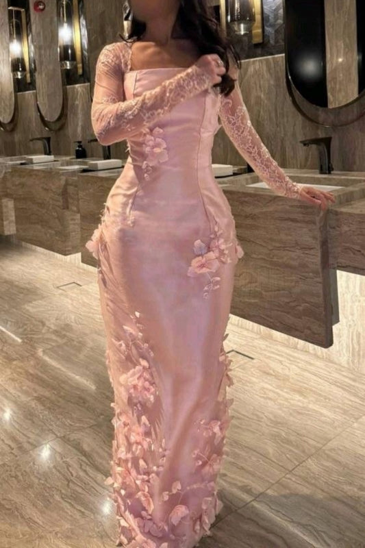 Pink Handmade Floral Long-Sleeved Satin Evening Gown gh7076