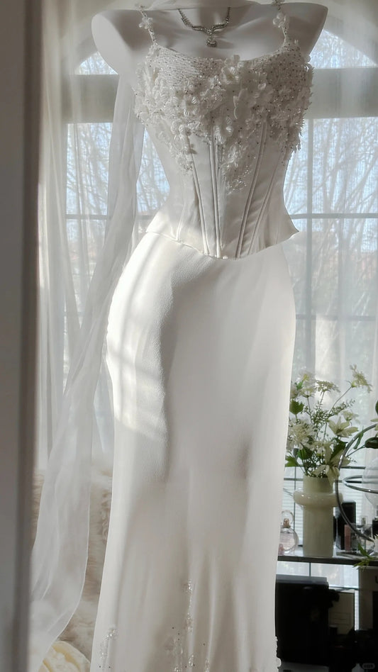 White Elegant Fashion Exquisite Floral Beaded Long Chiffon Ball Gown Evening Dress Party Dress Two Piece Set gh4005