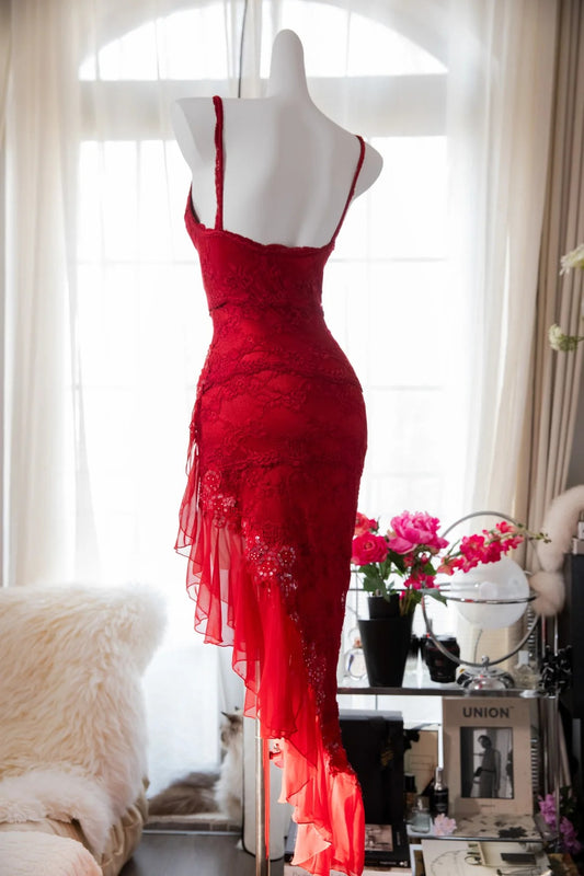 Red Fashion Elegant Delicate Floral Beaded Spaghetti Strap Midi Ruffle Mermaid Slim Fit Lace Chiffon Ball Gown Birthday Party Dress Evening Gown Prom Dress gh3977