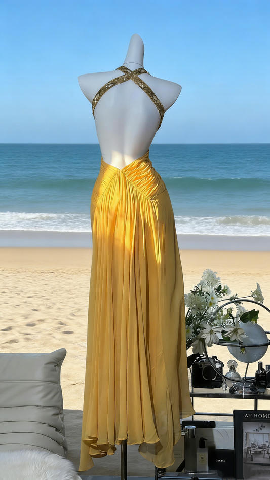 Bright Yellow Satin Halter Gown - Sequin Embellished Backless Slim Evening/Red Carpet/Summer Party Maxi Dress gh6984