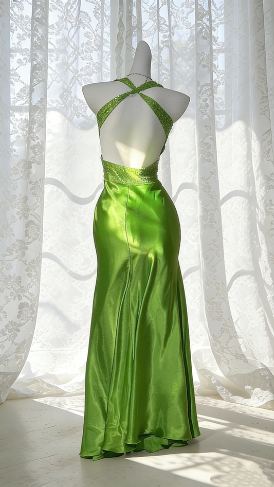 ✨Electric Green Halter Backless Gown - Satin & Sequin Mermaid Dress gh6942