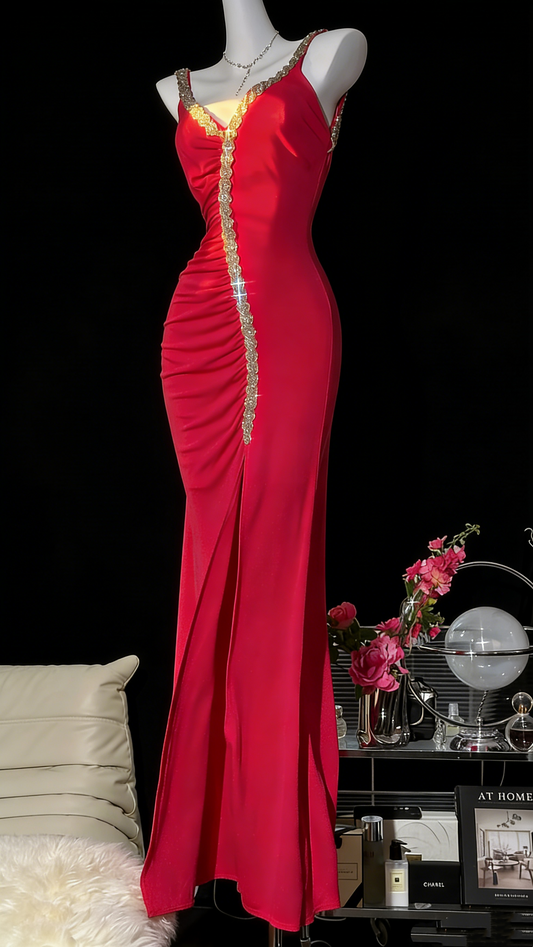 Red Romantic Gorgeous Fashion Elegant Exquisite Beaded Long Chiffon Ball Gown Evening Dress Birthday/Wedding Guest/Vacation Party Dress Prom Dress Valentine's Day Date Dress gh4027