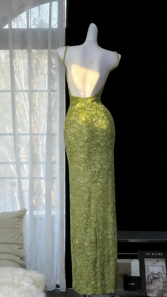 Lime-Green Spaghetti Strap Gown - Square Neck Backless Slim Mermaid Evening/Red Carpet/Summer Party Maxi Dress gh6986