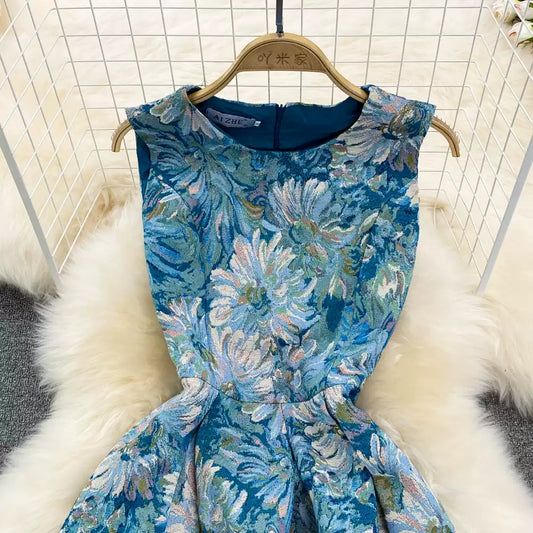 Summer retro palace style oil painting jacquard round neck sleeveless waist slimming medium and long A-line dress 11287