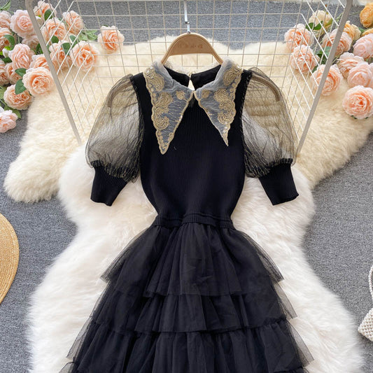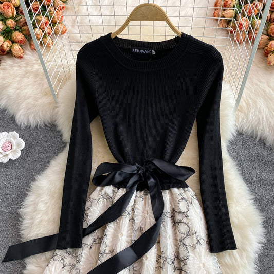 Stylish black A line knitted patchwork dress 160