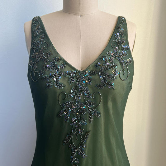 Green Vintage Fashion Elegant Exquisite Floral Beaded Swing Neck Long Chiffon Tulle Ball Gown Evening Gown Party Dress Prom Gown gh3719