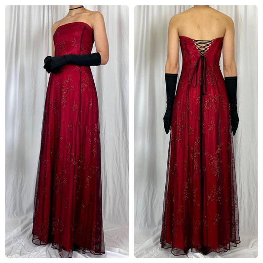 Red and black shiny fashion retro elegant exquisite floral corset long chiffon tulle ball gown evening dress party dress prom dress gh3713