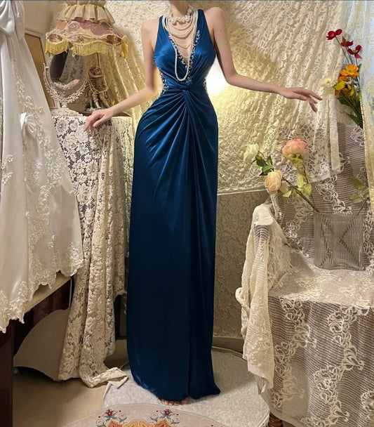 Blue Beaded Elegant Long Satin Ball Gown Evening Gown Party Dress gh4460
