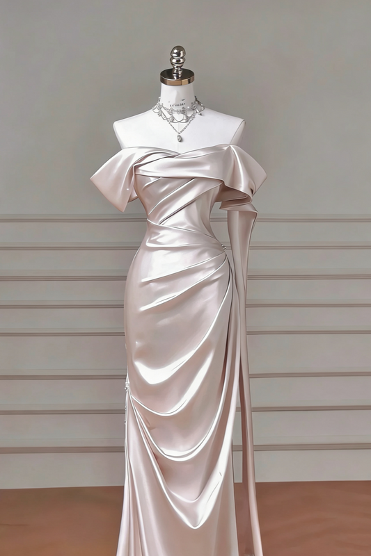 High-End Texture Style Champagne Gold Satin Off-Shoulder Ruched Train Gown - Elegant Dress for Dinner & Red Carpet gh6546