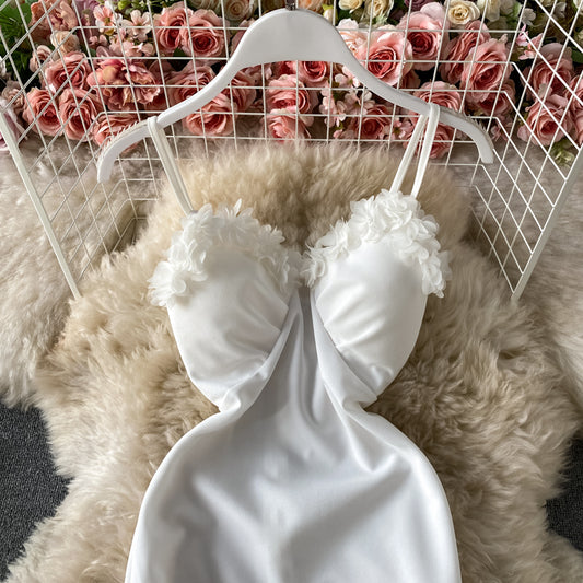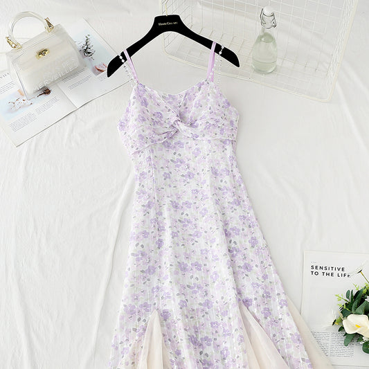 Design sense niche purple fishtail skirt Chiffon floral suspender dress 4124