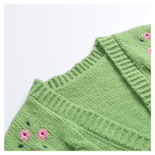 Flower embroidery round neck knitted sweater cardigan coat 7303