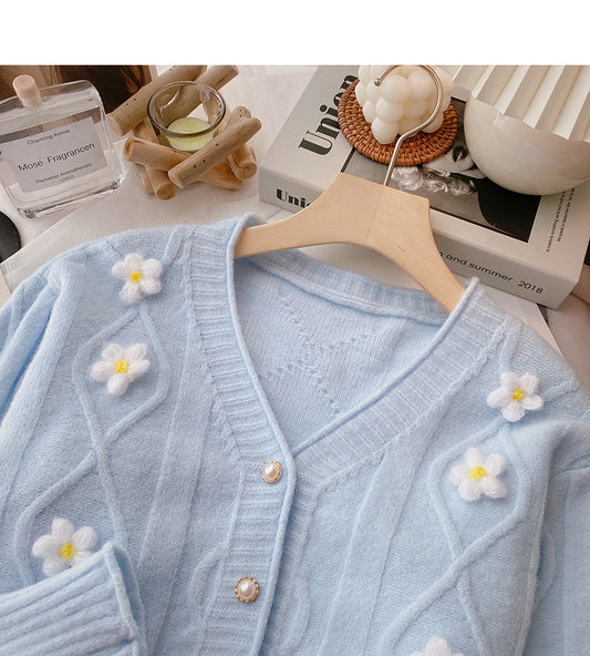 Floret three-dimensional design V-neck knitted cardigan 6475