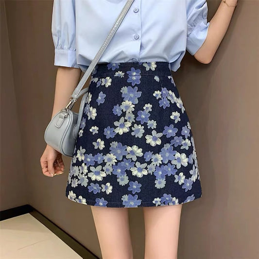 Flower denim skirt, new style, high waist bodycon skirt, A-line skirt 3556