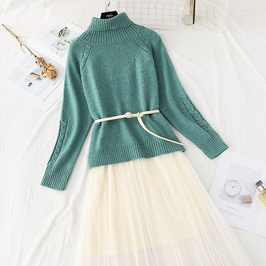 High neck sweater knitted dress mesh two-piece suit skirt 3960