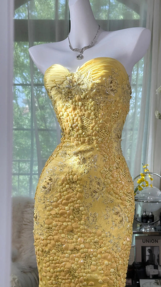 Yellow Elegant Vintage Solid Color Exquisite Yellow Beads Short Chiffon Tulle Homecoming Dress Prom Dress Evening Dress Birthday Party Dress Prom Dress gh3949