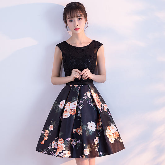 Black round neck floral pattern short prom dress, homecoming dress 7853