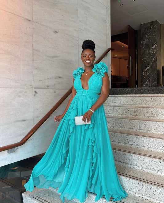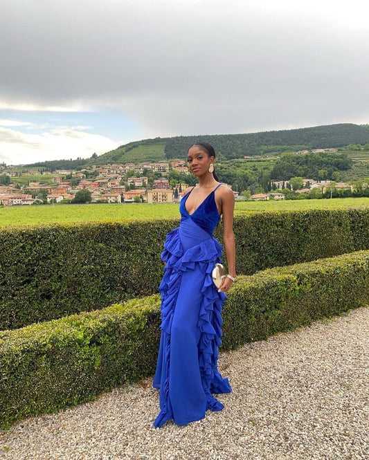Blue v-neck low-cut hem ruffled slim long chiffon ball gown evening dress party dress gh3037