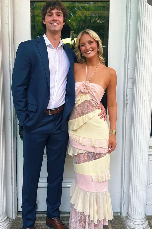 Blue floral lace ruffle long two piece suit evening gown party dress gh3011