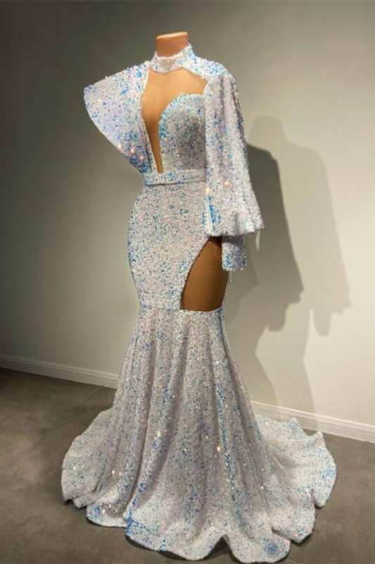 White One-Shoulder Long Sleeves Prom Dress Mermaid Sequins Lace With Split gh792