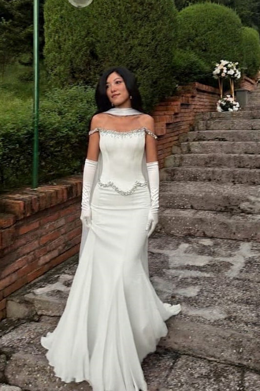 Elegant White Mermaid Gown | Off-Shoulder Rhinestone Dress, Gala Friends Gathering Fashion Outfit gh6454