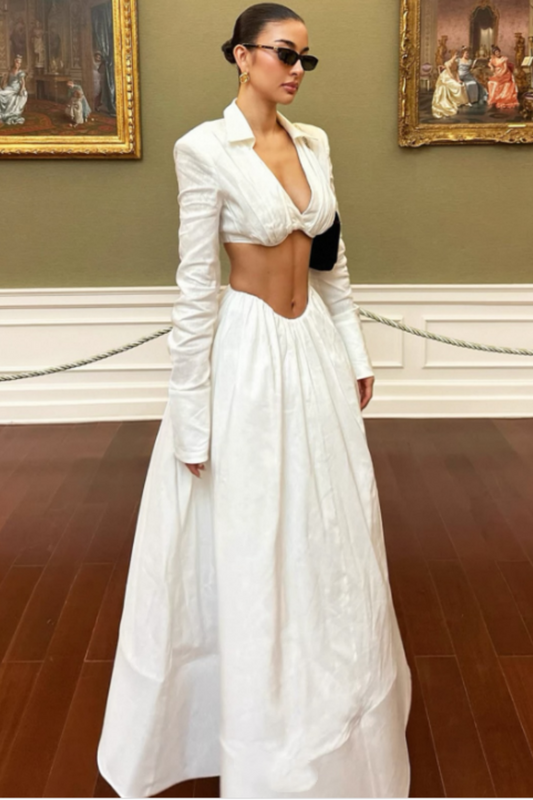 Chic Luxury Edgy Style Cutout Set Dress | White Shirt-Style Bandeau + Ballgown Maxi Skirt for Art Exhibition Gala Luxury Social Outfit gh6437