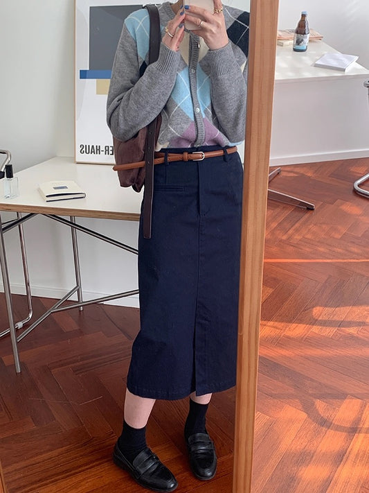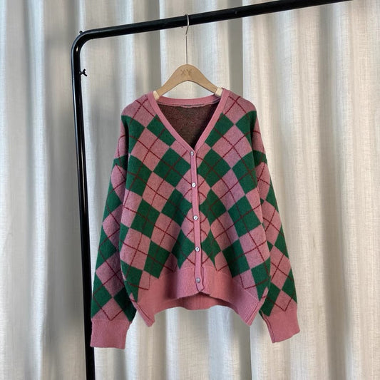 Rhomb, cardigan, V-neck contrast color British style sweater coat, autumn vintage long sleeve knit top 1425