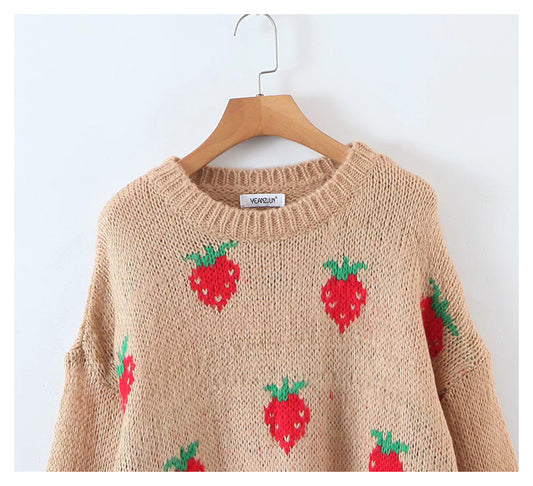 Strawberry jacquard mohair sweater loose round neck top 7743