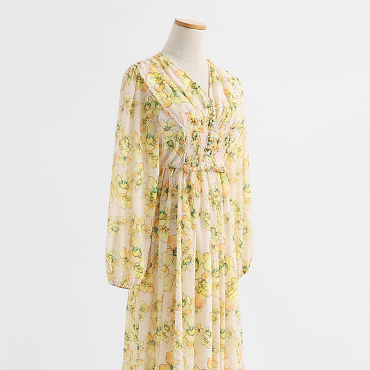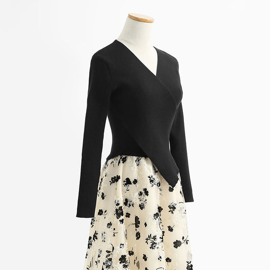 Floral dress long sleeves show thin temperament velvet skirt long skirt 2190