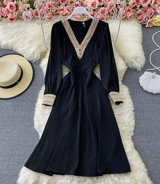 Elegant v neck lace long sleeve dress black dress 854