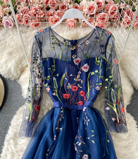 Blue A line tulle dress blue embroidery dress 852