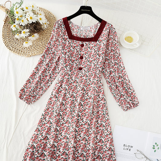 French tea break retro square collar niche chiffon long skirt 4836