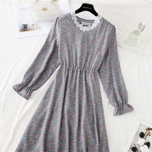 Slim temperament gentle wind retro Lapel lace stitched Chiffon Skirt 4809