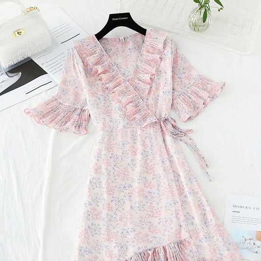 Square neckline Floral Chiffon Skirt French waist closing slim 4665