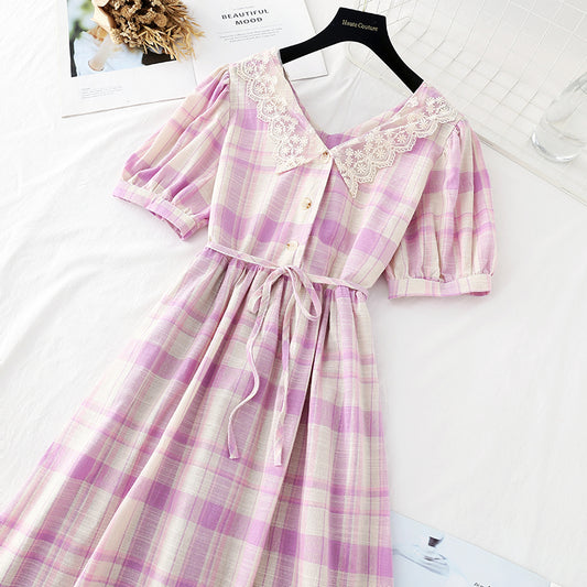 New lace doll collar sweet Plaid Cotton Linen Skirt fairy super fairy series 4598