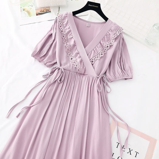 New style bubble sleeve fairy French retro sweet first love long skirt 4600