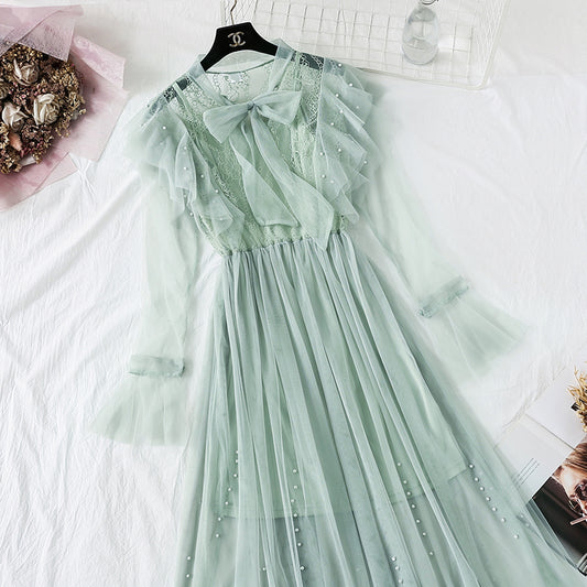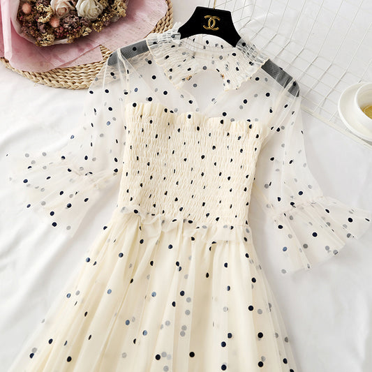 Small wave dot mesh dress retro long skirt over the knee 4465