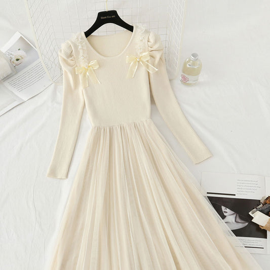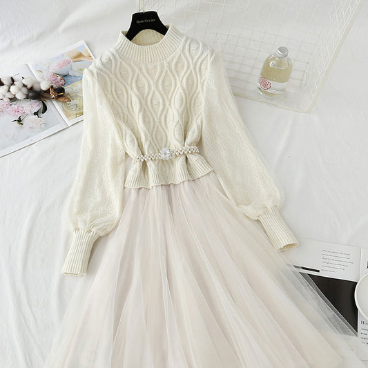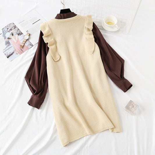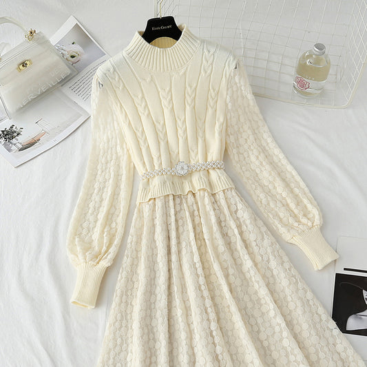 Knitted dress women's super fairy lace Plush stitched wool dress 4439