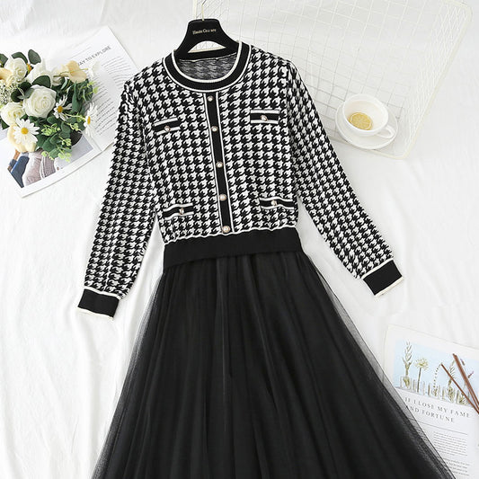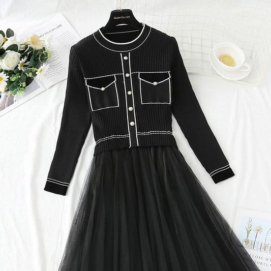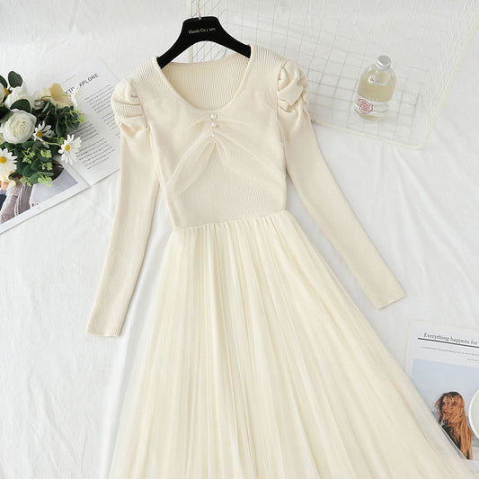 Mesh stitched knitted dress temperament long skirt 4416