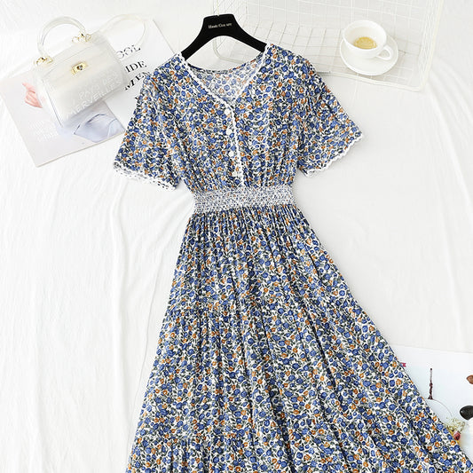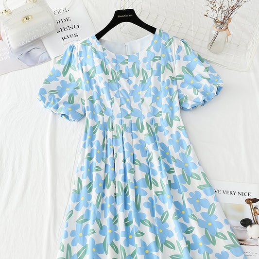 Bubble sleeve cotton linen dress gentle wind broken flowers 4248