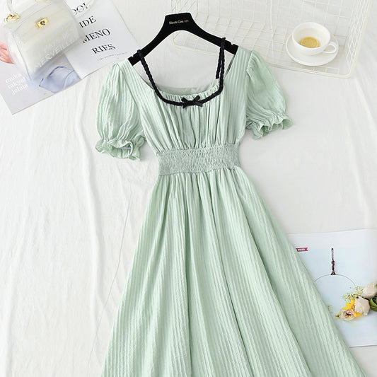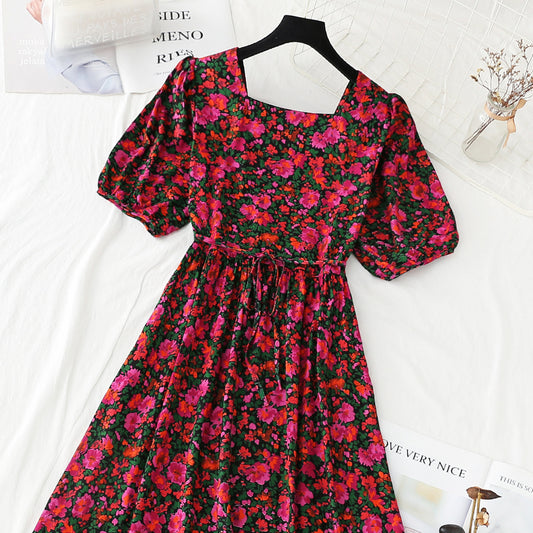 French square neck bubble sleeve fairy skirt with thin temperament 4241