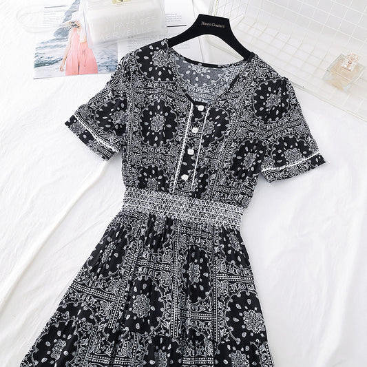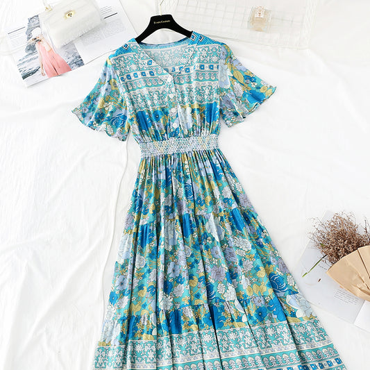 V-neck French waist closing thin Floral Cotton Dress 4212