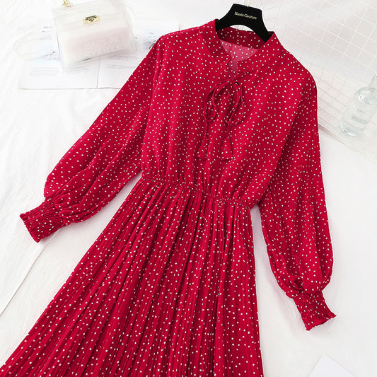 Chiffon Vintage wave point pleated knee bottom skirt 3845