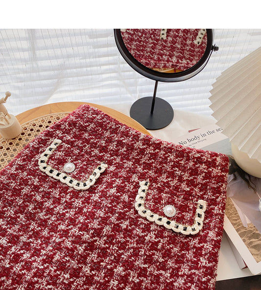 Fake pocket high waist tweed plaid skirt 5383