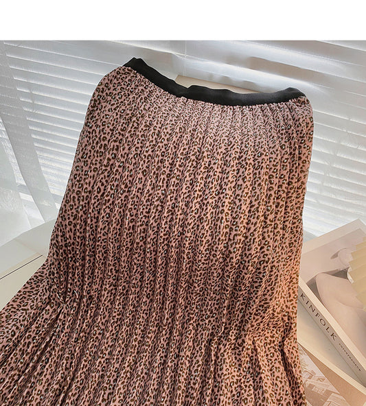 Hong Kong style retro leopard print thin pleated A-line skirt 5744