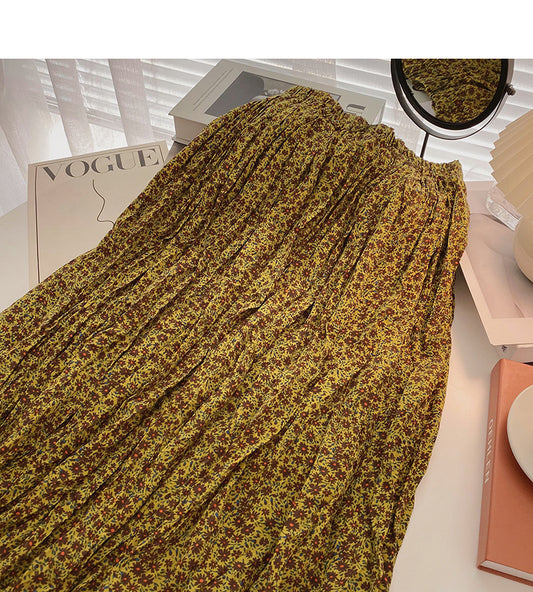 Hong Kong style retro floral high waist elastic A-shaped large swing skirt 5738
