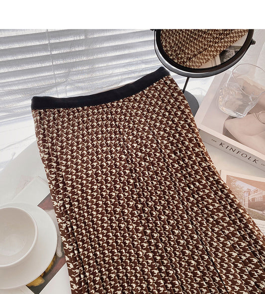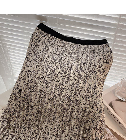 Hong Kong style retro printed leaf A-shaped medium length skirt 5739