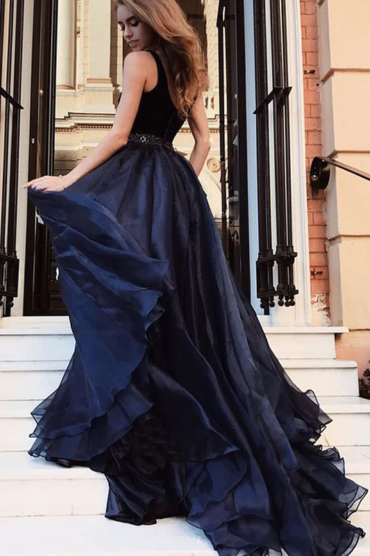 Dunkelmarineblaue lange Ballkleider aus Tüll, rückenfreie dunkelblaue lange formelle Abendkleider gh2265