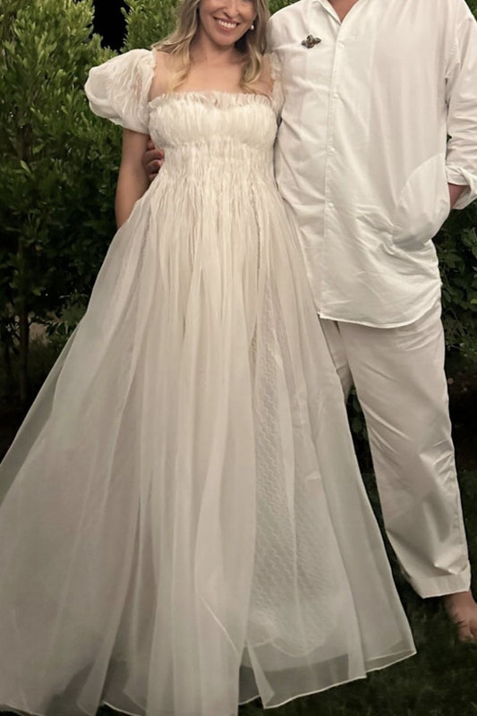 girlhomeshops-Weißes, schlichtes, lässiges, modisches, langes Ballkleid mit künstlerischen Puffärmeln, Umstandskleid gh5851